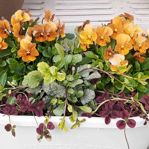 こんばんは😊 11月2日に投稿したビオレッタ(グレイッシュオレンジモンキーズ)の寄せ植えです🍀 1ヶ月経って、お花の数が増えて、とても可愛いです☺️ リーフは斑入りワイヤープランツ、クローバー、ウンシニアです🍀 今日も寒かったですね〜😅 暖かくしてお過ごしくださいね〜🍀