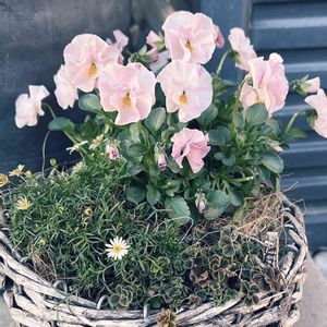 ビオラ、クローバー、ブラキカムの寄せ植え🧺 取手が取れてしまったけれど、カゴも好きなアイテムの一つです💖