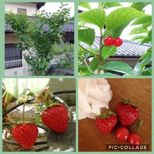 果物収穫💗 自然栽培(ほったらかし)で美味しそうなイチゴ🍓とサクランボ🍒ゲット😆 でも、サクランボ🍒はあの木でこのコ🍒しか無事実りませんでした😅 イチゴ🍓はランナー伸ばして数個株があるので気がついたらこのようにイチゴ🍓が実ってます😙