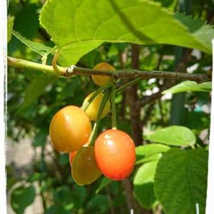 「さくらんぼの木」 うちの小さい花だんで毎年実をつけてくれます。 もうすでに 鳥たちがつっついて食べられちゃってますけど。😅 もうすぐすると真っ赤な実になります。 今年は どれぐらい収穫できるかな~⤴😄