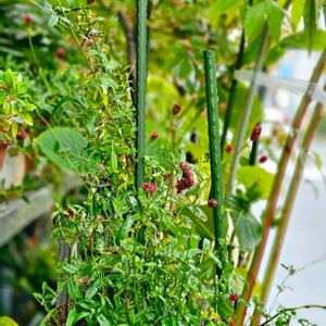 こんにちは😃 以前投稿したグロリオサ❤️🔥高いところでまた咲いてきました 今年の緑のカーテンはアラカルト❤(◕‿◕✿)グロリオサ、パッションフルーツ、零れ種の風船カズラと朝顔が自由気ままに網をつたっています パッションフルーツのお花が咲いたら受粉しようと待ち構えているのに全然咲きません😭何でかなぁ⁉️