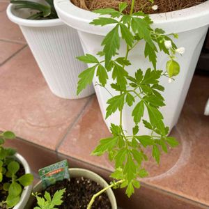 風船カズラに花が1つ咲いていました☺️ 先月バラの苗を購入したら2ポット苗を頂けて、まだまだ蔓はあまり伸びてないのに暖かいからか小さな蕾をつけ始めました😊