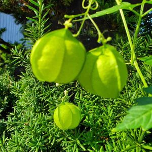 午前中投稿した、風船カズラの風船の部分です。 小さな風船が3個付きました💕 薄緑色の優しい色です。 お花の部分は隣の松の木🌲に絡まって伸びています。 いつまでも、この可愛い姿が見れるといいですが…🤔
