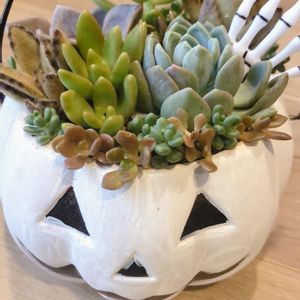 お店に飾る用ハロウィン寄せ植え🥦 Seriaの手形髪飾りと 白に塗り替えたニトリで 昔買った小物入れ 旦那も多肉好きになってくれればな〜 全く響きませんね〜🙄笑