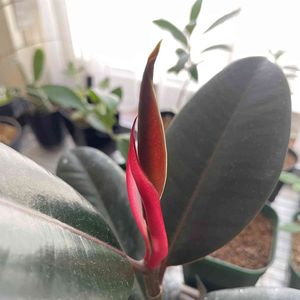 フィカスバーガンディの新芽🌱が、また開きそう✨ 赤い部分から緑がチロっと見える👀✨ 8日前に新芽が開いた時に出てきた子がグイグイ成長してる。 ありがとう🙏🏼嬉しいよぉ〜🥰💕