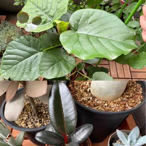先月お迎えのフィカス仲間! ウンベラータとバーガンディ うちに来てから開いた新芽がすごく大きいです🌱 ウンベラータに至っては私の手のひらより大きい🫲… 他の葉とスケール感が違う😅 ウンベラータ新芽が開いたら剪定しよーと思ってたけど迷っちゃいますね!