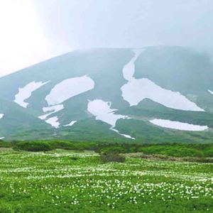北海道 大雪山旭岳 裾合平 カムイミンタラ(神々の遊ぶ庭) 群生するチングルマ バラ科 草状の落葉小低木。 枝は地面を這ってひろがり、大きな群落となる。 雪解けから2週間で、花を咲かせ、夏の終わりには綿毛をとばす。 2019.7.24 遠くはガスってます。残念❗️