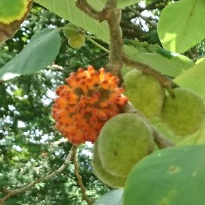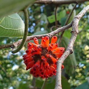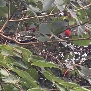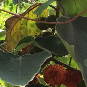 カジノキ 緑の未熟な実と、赤い熟した実。 今まで気にもせず下を通っていましたが、面白い実がついていました🙄 雌雄異株とのことなので、来年は花を確認したいです。