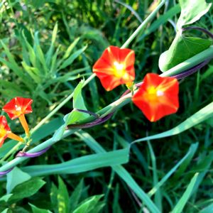 散歩途中に歩道脇で見つけました😃 夏にぴったりの綺麗な色で咲いていました しかもそばにある植物に巻き付き 人の褌で相撲、状態😅😅😅😍😍 その姿勢がユーモラスで気に入ってしまいました笑