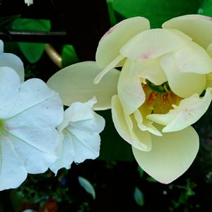 開きかけの蓮 零れ種のペチニュア さっき風にはらはら 散りました。