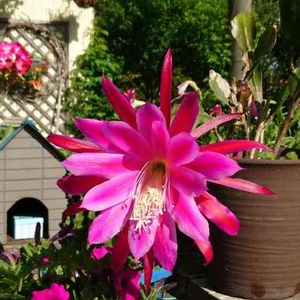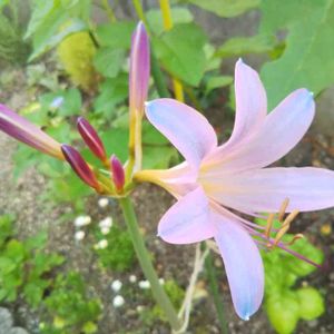 芽に気づいてから6日目の朝 咲いた花はピンクかと思ってたら、淡いブルーのグラデーションが入り涼しげだよ☺️