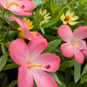 アベルモスクス🌺 ケイトウ✿︎ マツリカ✿︎ ハイビスカスに似た1日花を咲かせるアオイ科のアベルモスクス。 赤花綿とも言われるけど綿とは関係ないらしいです。 寒さに弱いので種で更新します🎶 花友さんが海老フライ🍤と言ってたけど確かに似てる😂 マツリカが咲いてないのでコレオプシス・ブラッシングピンクとコラージュ🌸