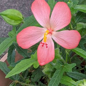 アベルモスクス(アジアンハイビスカス) 咲きました 土の上に置いといて、鉢の下の穴から根っこが張っていて 咲きそうだからって、根っこを スンッ(ㅎ.ㅎ )って、剥がして ベランダに移したら 半分枯れちゃつたんだー('﹏*๑)ウッ… 直根性っていうのかな? 根っこいじると 良くないみたいです 失敗から、学んだかなー 今度気をつけよー