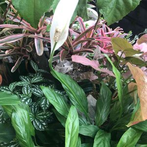 こんにちは😃 先程投稿したpicと同じ、玄関前の寄せ植えです☺️ ⬆️ シクラメンの背面。スパティフィラムさんが、こちらを向いています😁 ⬅️ オリヅルランの子株がワッサワッサ🍀 ➡️ チェッカーベリーの実が一個だけ残ってます🥰