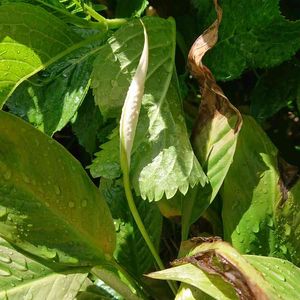 【万葉の中庭シリーズ:石臼遊び:生花編】 ♡Flowers Collaboration series ♧スパティフィラム:Spathiphyllum ☆綿の木:cotton plant ♡昨日の朝方の中庭で、こんなことをして写真を撮りながら石臼と戯れていたら、急に雨が降り始めましたので、慌てて綿の木を倉庫にしまい、一昨日新たに迎えた「スパティフィラム」を残して撮影を続行していたら、濡れてしまいましたょ⁉︎ *スパティフィラムは丈夫で育てやすいので、小鉢から中鉢で楽しむ室内向け植物として親しまれています。 白い花びらのように美しいのは「仏炎苞:ぶつえんほう」と呼ばれる部分で、花はひも状の部分の肉穂花序:にくすいかじょに多数つきますが、小さく目立ちません。 光沢のある緑の葉と白い苞のコントラストが美しく、条件がよければ年中開花しますょ⁈ 花が終わったら数分けして増やすことができますが、小生は育てきれずに昨年のものは枯らしてしまいました⁉︎ 日陰で水はけのよい土地に植え付けるのが良いみたいデスら😸 小生は日当たりの良い場所で、どうやら土地の水はけの余り良くない場所に植えていたようデスら😹 室内だけだと花がつかないことがあるというので、株分けしたら外の庭に植え込んで、放置していたら気づかないうちに枯れてしまいました⁉︎ 今年は、育て方を学んでリベンジ・リトライしますデス⁉︎ 花は『水芭蕉をひとまわり小さくした小型版』に似ていますが、葉っぱは「カラー」に良く似ています。 ♧属名の学名「Spathiphyllum:スパティフィラム」は、ギリシア語の「spathe(仏炎苞)」と「phyllon(葉)」が語源となり、花の特徴を表しています。 ♡花言葉の由来: 花言葉の「上品な淑女」「清らかな心」は、清楚な雰囲気を漂わせるスパティフィラムの白い花姿にちなむと言われています。 by Kazyan's Green Shot Artistic:Manyou bush garden 2021 Mar 12//past am 06:40':upload