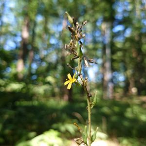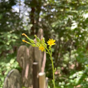 ヤマニガナ(山苦菜) *キク科アキノゲシ属 花期は7〜9月 北海道〜九州の山地の林縁や草原に生育する! 草丈は0.6〜2mほどで1cm位の花を付け8〜10個の舌状花のみからなる。 葉は卵形楕円形で下部の葉は羽裂する。 花期にはまだ早いとは思いましたが、小さな一株だけ咲き出していました。 7月5日撮影
