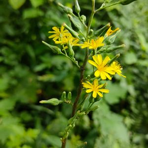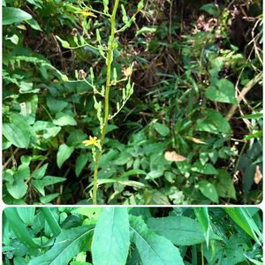 山野草もろもろ とても背の高い草で、これも私の背丈は超えています。 ヒョローと立ち上がって円錐状の花序をつけますが、花はあまりかたまって咲くことはなく、まばらなので地味な感じです。 ニガナの仲間で、キク科ヤマニガナ属の「ヤマニガナ」です😍 下部の葉の中に、頭状羽大に裂ける葉が混じることが多いです。アキノゲシも似た感じの葉をつけますが、あちらは逆向きの羽状深裂した葉が混じりますね🤔