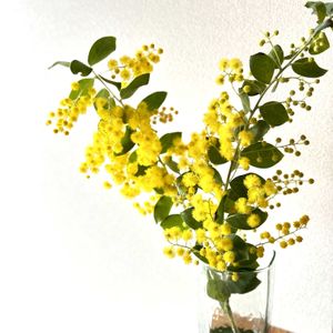 今日のお花 ミモザ ふとお花屋さんを覗いたら 「今日3月8日はミモザの日です」 とペーパーで包まれたミモザの花束が沢山💐 そうだった、今日はミモザの日🟡 わーこれは買うしかないなぁ☺️ ふわふわ満開のミモザ、お持ち帰り💐 帰宅後早速飾り、記念撮影🤳💛 ふっくら可愛いミモザ 見ているだけで幸せになります✨