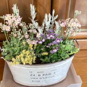 パステルカラーの寄せ植えには 白いブリキ鉢をセレクト