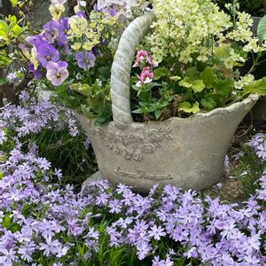おはようございます✨✨ 庭の芝桜に、ビオラやプリムラウィンティ を寄せた鉢を置いてみました。 色合いの雰囲気が似てるので、 とても素敵な景色になりました。