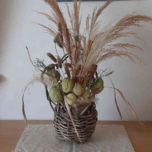 アケビのかごに 飾るものが無くなったので… 天然のドライフラワーを飾ってみました。 ちょっと欲張り過ぎたかな 花の活け方がわからないので ちょっとごちゃごちゃに