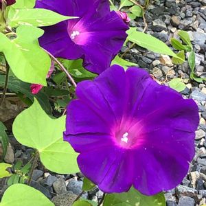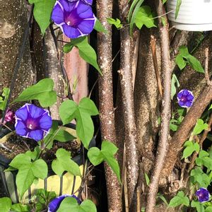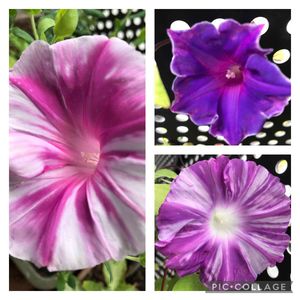 おはようございます♪ 『曜白朝顔 富士の紫』 いつもは、 右上のような花姿ですが、 根元の方に、 下2つのお花が咲いて ました。 違うお花のようです😅 花びらに傷がついたり、 欠けているものが チラホラ出て来てます。 蕾はまだ付いているので もう少し楽しませて くれるかなぁ♡ ありがとう🍀 頑張って❣️