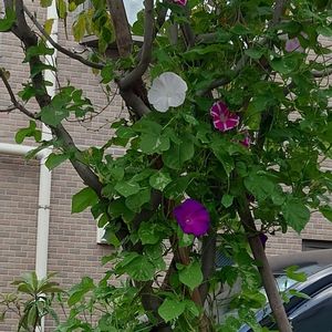 朝顔 菜園?に1ヶ月くらい前からこぼれ種の自生😀 菜園がジャングルと化すので蔓を伸ばさずに花がどれくらい咲くか?お試し中😀 どの蔓も三つ目の新芽をピンチする事を繰り返し中😀 今まで一輪しか咲かなかったが、今日初めて二輪咲く😃