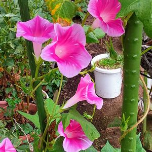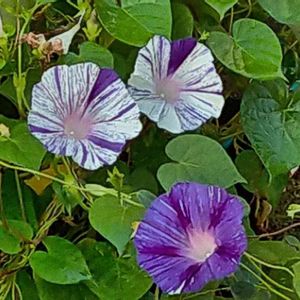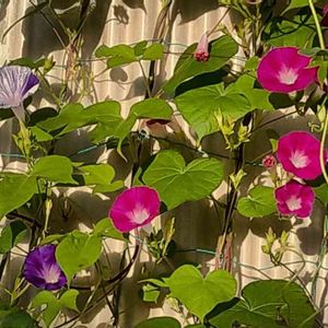 うちの朝顔~白い子は弱くて、あまりツルも伸びず、 一緒に撮れませんでした~😑💔 ピンク色も植えたと思ったけれど~?? あれー?🙃 出てきませんでした~😭 小さい紫の子は、もう何年も勝手に無数に芽が出てきては私に摘み取られる可哀想な子で、何本か残れた子が咲いています😆 薄紫の子は強健で、あっちこっちからツルを伸ばして、 しぼり風の濃いめだったり、ピンク色だったりと、 次々に変身してくれて私を楽しませてくれています~♪( ◜ω◝و(و "