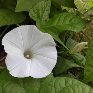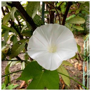 『朝顔♡』 数十年の眠りから覚めた真っ白朝顔、昨年から咲きだしました😍 花桃の木に守られています🤗