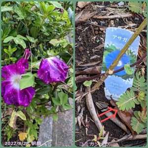 朝顔とコミカンソウ ラベルの色合いと違う朝顔が、咲いていましたね。 側には、コミカンソウが生えていました。 アパート敷地内の花壇にて。 2022年8月28日撮影
