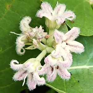蘿藦(ガガイモ) キョウチクトウ科ガガイモ属のつる性多年草。日当たりの良いやや乾いた原野に生える。地下茎を長く伸ばして殖え、茎を切ると白い乳液が出る。葉は対生し、長さ5〜10㎝、幅3〜6㎝の長卵状心形で先は尖り、裏面は白緑色を帯びる。花期は7〜8月。葉腋から花序を出し、淡紫色の花をつける。花冠は直径約1㎝で5裂し、内側には長い毛が密生する。中心部にはずい柱があり、柱頭は長く花冠から突き出る。副花冠は環状でずい柱の基部を取り巻く。果実は袋果。長さ約10㎝、幅約2㎝の広披針形で、表面にはイボ状の突起がある。種子は扁平な楕円形で翼があり、基部には種髪(しゅはつ)と呼ばれる白い毛が多数つき、風でふわふわと飛ぶ。昔はこの毛を絹の代わりとして針山に用いたり、朱を染み込ませて印肉にしたり、鏡面を磨いたともいわれる。未熟果、若芽、若茎を天ぷらにして食べる。果実から出る乳液をイボ取りとしてイボに塗る。 ガガイモの『イモ』は地下にある長い根芋のことではなく、角形の果実を芋に見立てている。熟すと2つに裂け、裂けた果実は舟形である。舟形の果実の内側は白色で光っていて、まるで鏡のようである。それで『鏡芋』の名前がある。『カガミイモ』が『ガガイモ』に訛っていった。その後、漢名『蘿藦(らま)』の字を当てた。また、日本神話にはガガイモの殻の船に乗った少彦名命が海を渡ったと記されている。 出典『野に咲く花』『都会の草花図鑑』『薬草の呟き』『野草の名前 夏』