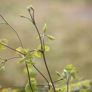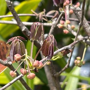 裸ん坊だったアケビの蔓に、ちっちゃな可愛い葉っぱがいっぱい出ているのを発見! あれ? 蕾もある⁈