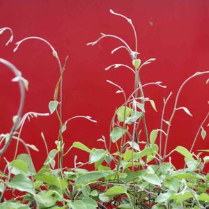 去年見つけたアオツヅラフジがある場所。 少し前に覗いた時には、枯れた蔓が見えるだけだったのに、いつのまにかモリモリと若葉が〜🍃🍃 若い蔓が巻き付く先を探して、踊っているようです🕺 たまたま赤い背景で映えます❤️