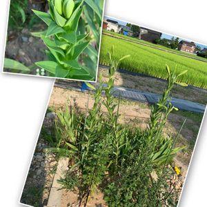 2023.7.14 お盆の花用に育ててる花 新テッポウユリ、もう直ぐ咲きそう😅 でも、1株の根元から2本、こんにちわ〜😳 ⬆️:お盆には早過ぎる😅 ⬇️:コレならイケる🦆🤔🥰 ここまでくるのに2ヶ月半だから、やっぱり無理か🙄