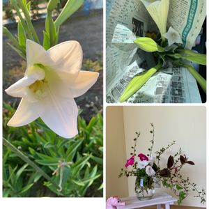 2023.7.24 撮影 初めてお盆用に育てた花達💞 昨日、投稿しそびれました😅 新テッポウユリ、咲きそうです 嬉しいけど…🙄 1番最後に咲きそうな枝別れしたのでも… ↖️:コレなら… ゆっくり育って〜🙏 ↘️:全体像