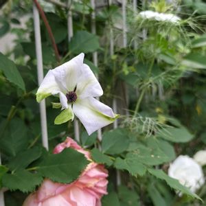 クレマチス アルバ・ラグジュリエンス 開花し始めました クレマチスはまだ開ききってませんが、バラとの無理やりコラボです ①ジュビリーと ②ジュノーと ③綺麗に開花したラグジュリエンス