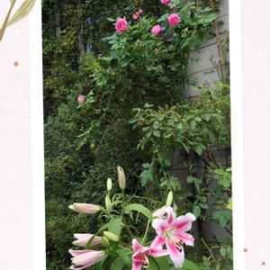 オリエンタル ユリ⚜️ 今朝から咲き始めました😍🩷 花友さん、有難うございます😍 今年は、一株から沢山の蕾が🩷 4株のうち、2株しか育ちませんでしたが、とても立派な株になって、蕾が一株に、10個くらいついています😮 背丈も伸びたので、薔薇の茂みを開けて顔を出しています😆 あと一株は?白?、かな? 二、三日中には咲き始めるかな?と思います 薔薇も終わり出したので、嬉しいです🙆 今年咲かなかったユリは、来年咲くのかな〜?