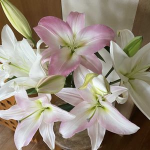 見切品のユリが開いてきました♪ 半額で200円を3束買って 600円でした♡満足🥰 しかもお花が大きいので(25センチ) ボリュームあります💕 良い香りにウットリです😍