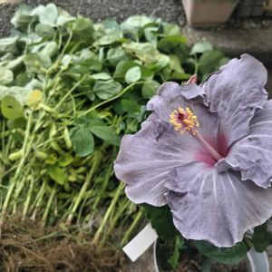 種を蒔いておけば何とか育つ枝豆の収穫。西側の日影ではハイビスカスが咲いていました。 食べないブラックベリーが実をつけています。