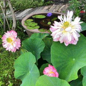 うちの茶碗ハスが咲いています。 開き始めたところに、昨日の豪雨☔︎で散ってしまうのではないかと心配してましたが、耐えてくれました😮💨 けど、花の開き方がちょっといびつになってしまいましたが😅
