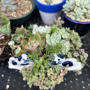 幸工房さん陶器鉢の猫ちゃんが セダムで隠れそう🫣
