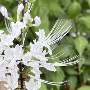 【猫の髭】《シソ科》 花言葉 「進歩」「貢献」 別名 キャットアイスカー オルソシホン クミスクチン 茎や葉を乾燥させたものは 健康茶(クミスクチン茶)やサプリメントの原料としても利用され、利尿や血圧降下、むくみや肌のてかり予防などの効果が在るとされています。
