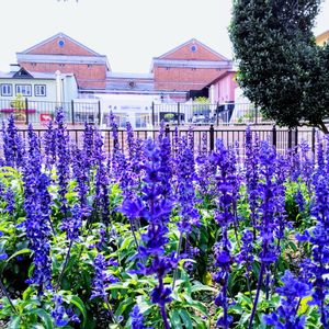ショッピングモールつかしん 青紫色の花がいっぱい咲いています。 サルビアファリナセア 別名 ブルーサルビア レンズで索引して出てきた名前です。