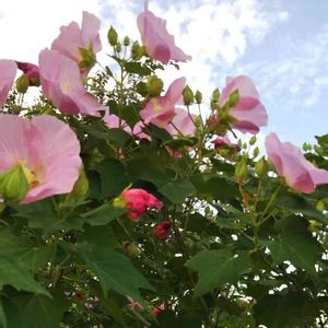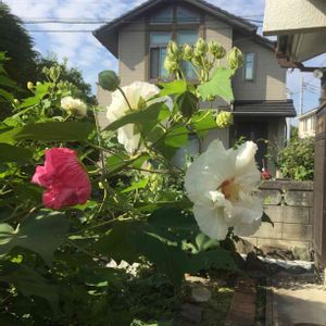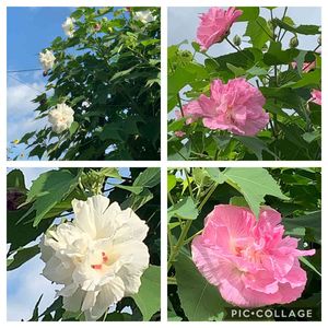 こんばんは🌃 今日も一日お疲れさまです◌⑅⃝♡♡⑅⃝◌ いつも通る通勤道 今朝の8時少し前は青空にくっきり きれいなホワイト❁❁❁ 午後には 少し曇り空の中 もう可憐なピンクちゃん 今年も咲いてた 酔芙蓉💕 素敵なお花です(◡‿◡ฺ✿)