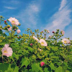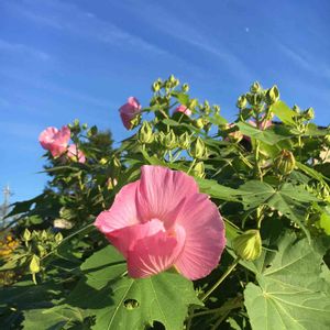 今朝、ウォーキングに出かけたら、ピンク色に染まる芙蓉に出会いました。 秋空と共にパチリ📷️