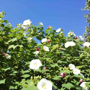 連投⑤(追加)🙏💦 酔芙蓉(スイフヨウ) 花色はひとつの花が白から赤へと変化する ♡→💗→❤️ 酔芙蓉は、芙蓉の花とは違い、朝に白い花を咲かせ、昼になるとピンク色になる変わったお花です。 朝花が咲き、夕方には萎んでしまう一日花で、ほろ酔いの貴婦人と言われたのです。 お酒に酔っているように見える事から「酔芙蓉」と名付けられたようです。 徐々にピンク色になりますので、1日中鑑賞していても飽きない珍しいお花です酔芙蓉の変種で一つの花に 白と赤が入り混じって咲くものがあるようです。 巾着田曼珠沙華公園で咲いていました。