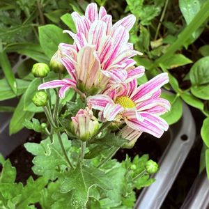 こんばんは。今日は先日苗を植えた菊の花が咲き出したのでパチリ。 ジョアという名前が付いていました。ちょっと珍しい柄かな?😄