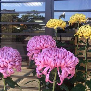 立派な菊だったので 写真撮ってみました。 菊の品評会で見るような立派な菊でした。 育てるのが大変なんでしょうね。 ガラスの扉に写ってる青空と瓦屋根も気にいってます😊