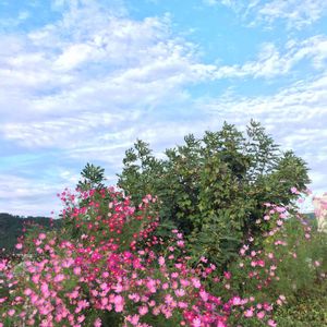 8月には朝顔が巻きついてたイチジクの木 今はコスモスとコラボしています (お隣りさんの畑にて)