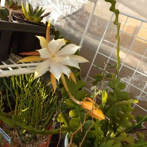 蕾がついてましたが、先ほど見たら咲いてました⁉️ はじめてのお花です。 赤か、白かと楽しみにしてました。 ユリのような甘い香りです。
